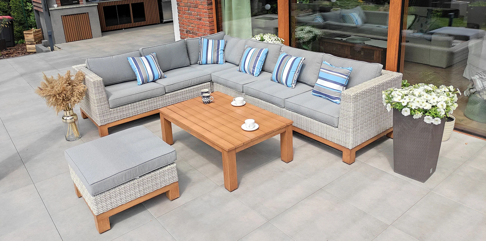 Poduszki są na stałe dopasowane do koloru technorattanu — to przemyślana całość. Chętnie doradzę, czy jasno-szary pasuje do Twojej elewacji.
