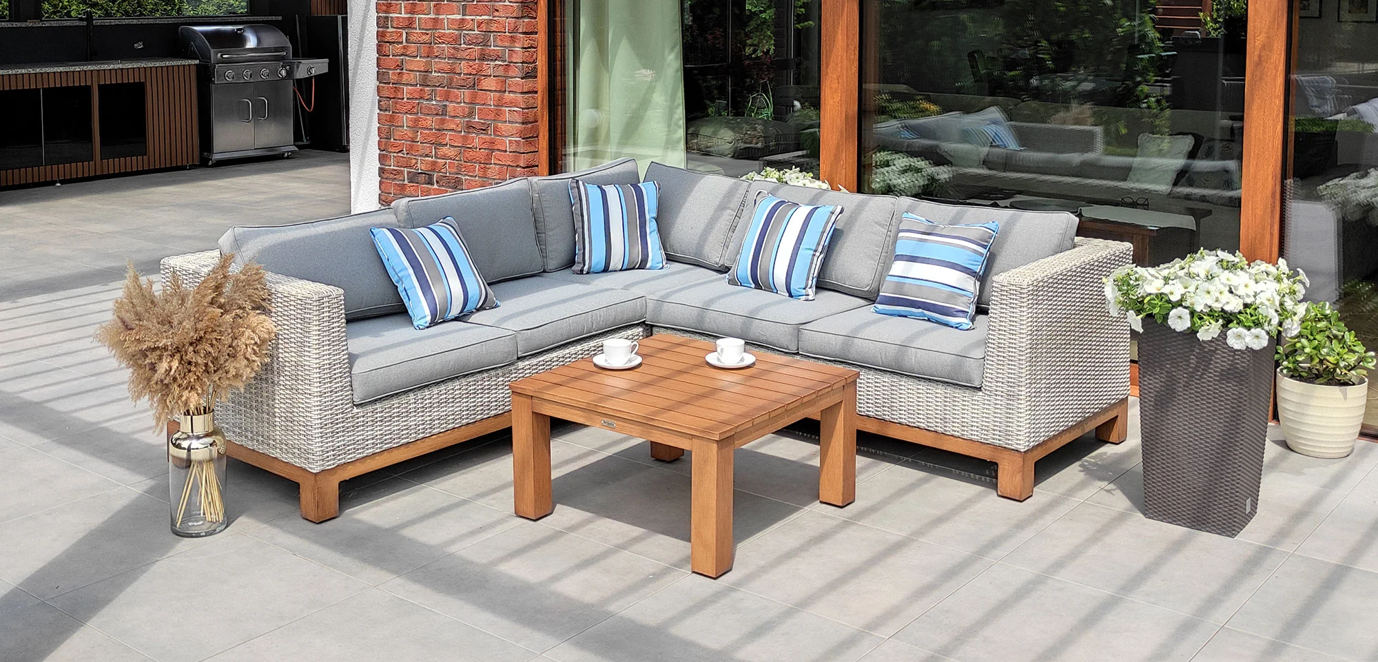 Zestaw przyjeżdża gotowy do rozstawienia. Bez szukania pasujących poduszek, bez dobierania stolika z innej kolekcji.