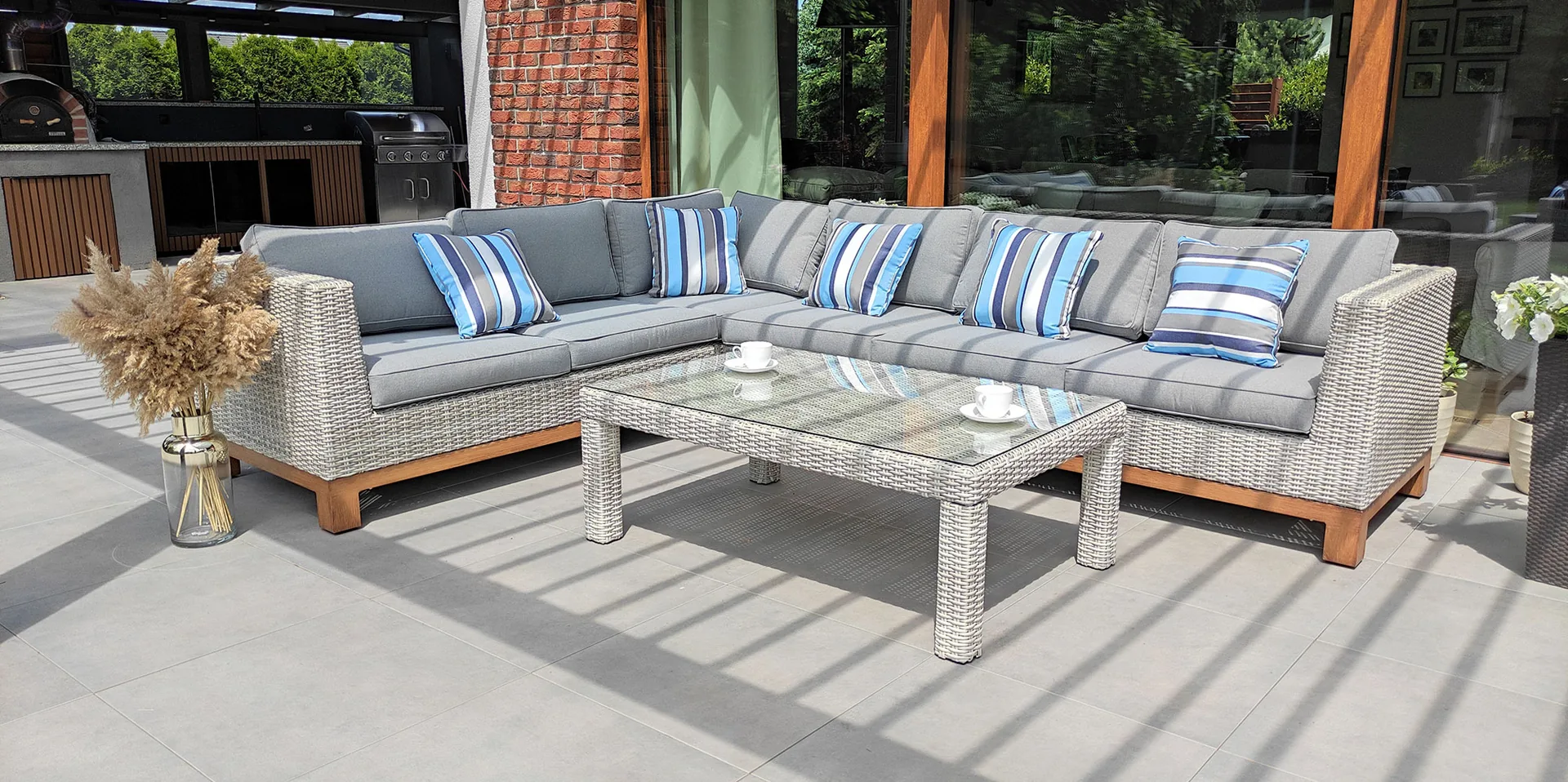 ANCONA w kolorze jasny szary współgra z jasną elewacją, drewnem tarasowym i kamieniem naturalnym. Poduszki są zawsze dobrane do odcienia technorattanu. Jeśli masz wątpliwości, czy kolor pasuje do Twojego tarasu — wyślij mi zdjęcie, dobiorę za Ciebie.