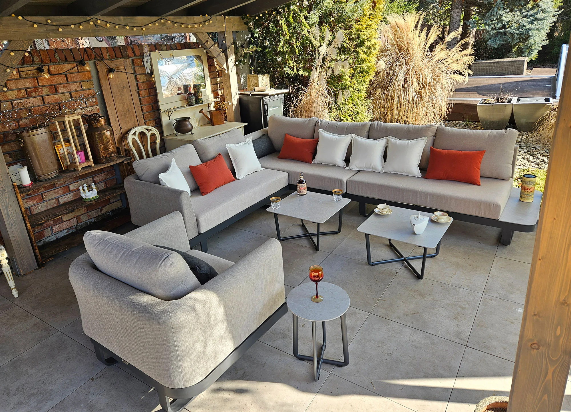 Jeden zestaw kolorystyczny, przemyślany do końca. Szara aluminiowa rama. Naturalne poduszki Olefin. Blaty z kamienia spiekanego. Razem tworzą całość, która nie wymaga dopasowywania do elewacji — pasuje do jasnej, ciemnej i każdej pośredniej.