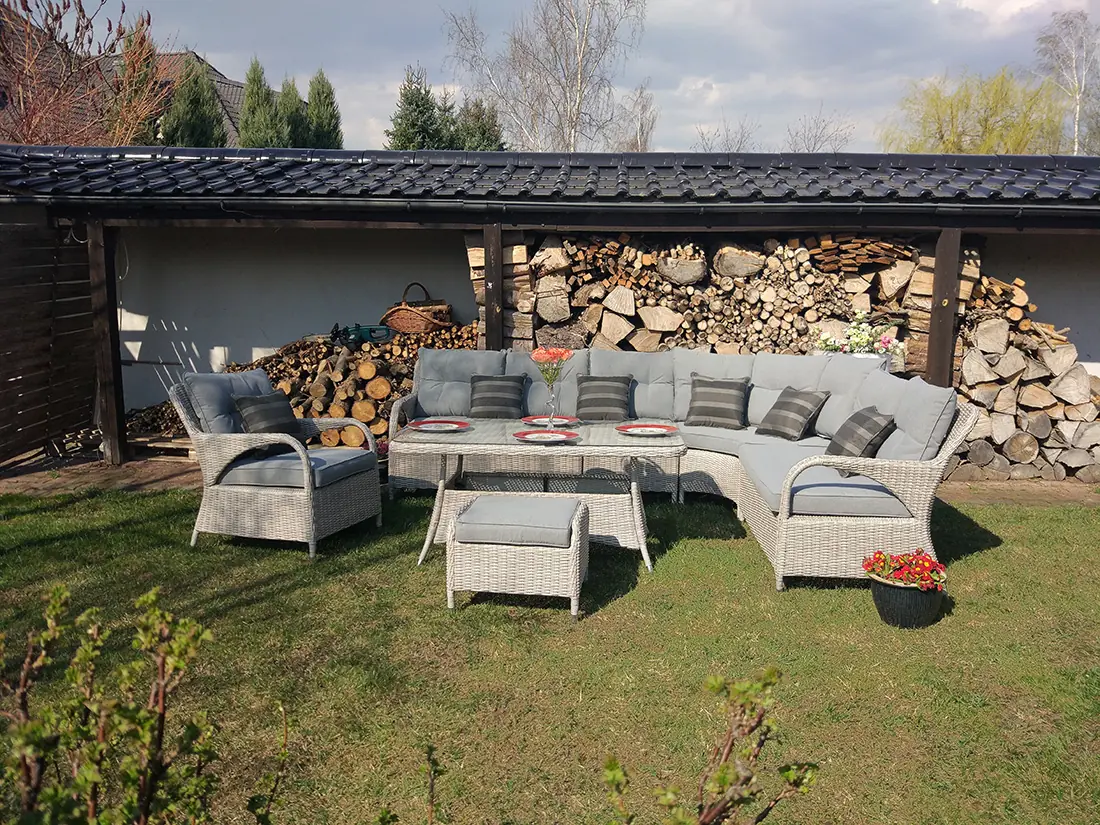 Poduszki są na stałe dopasowane do koloru technorattanu — każdy wariant to przemyślana całość. Chętnie doradzę, który kolor najlepiej pasuje do Twojego tarasu.