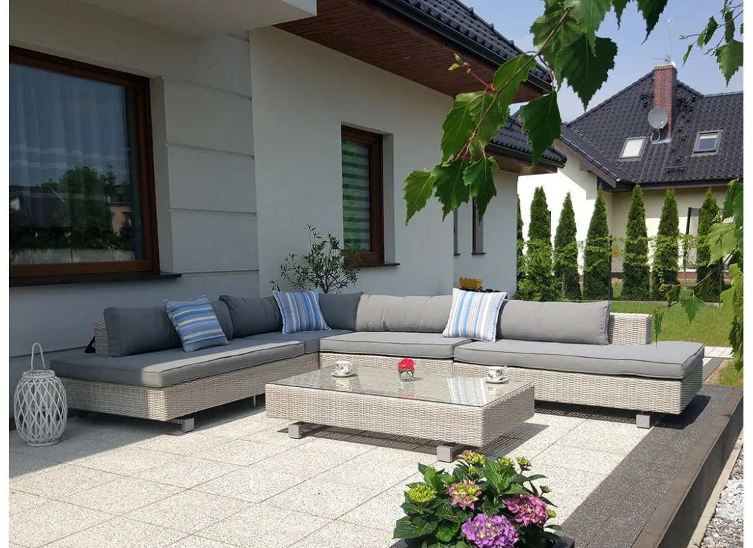 Stonowana, jasna kolorystyka technorattanu z poduszkami dopasowanymi przez producenta — kolor poduszek jest przypisany do odcienia rattanu, tworząc przemyślaną całość.