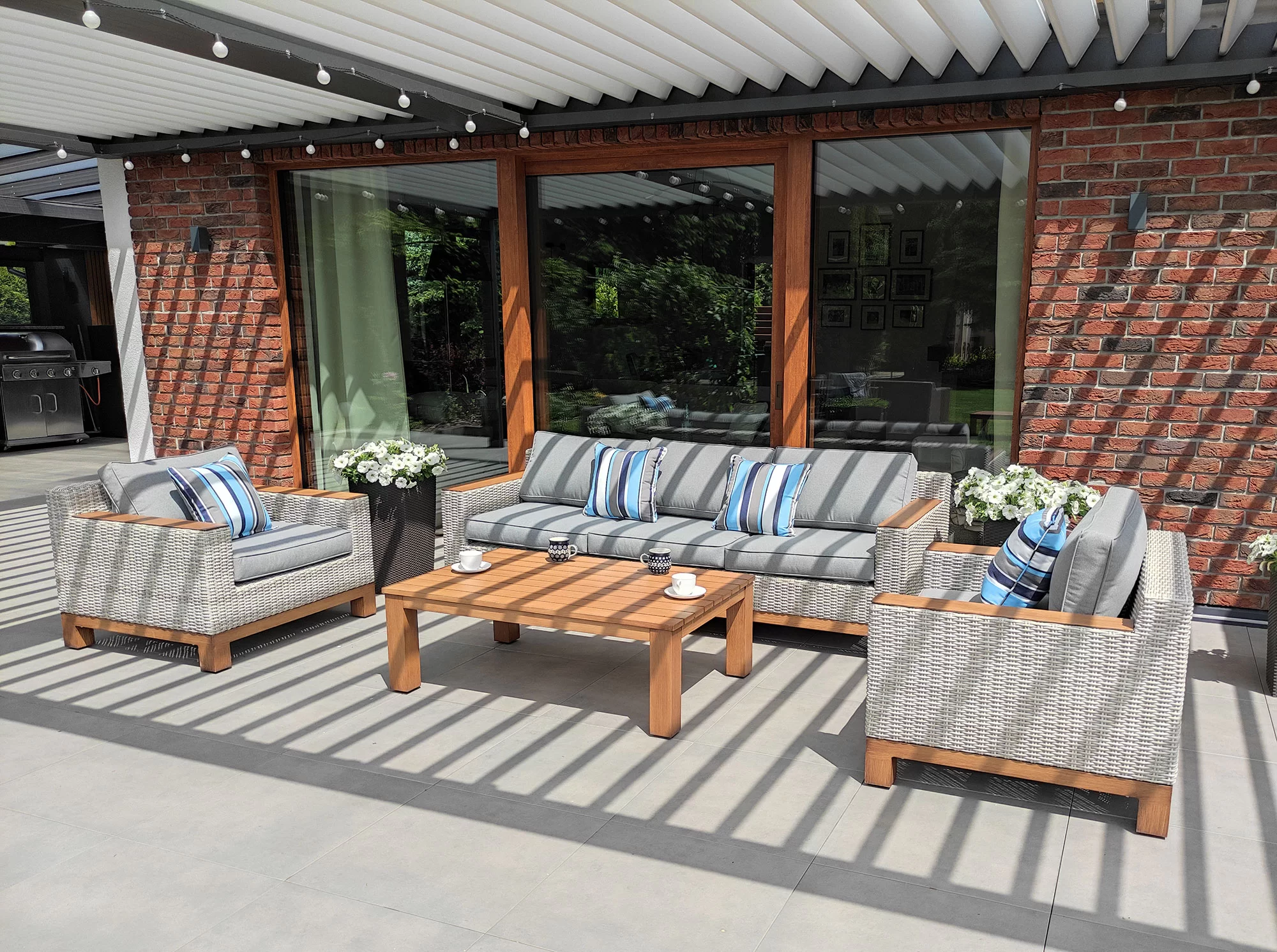 Technorattan PE i rama aluminiowa wytrzymają bez zadaszenia przez wiele sezonów — UV nie płowi koloru, deszcz nie szkodzi konstrukcji. Poduszki radzę chronić: schować na zimę albo przykryć pokrowcem, kiedy nie używasz.