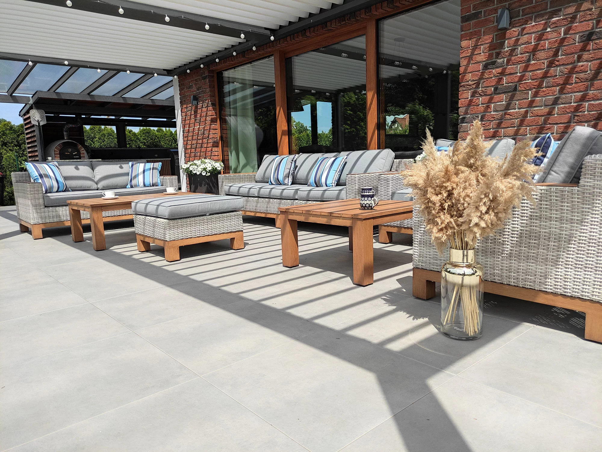 Aktualnie jeden kolor: jasno-szary technorattan z szarymi poduszkami. Kolor jest neutralny i pasuje do większości posadzek tarasowych oraz elewacji. Jeśli masz wątpliwości, wyślij mi zdjęcie tarasu — doradzę bez zobowiązań.