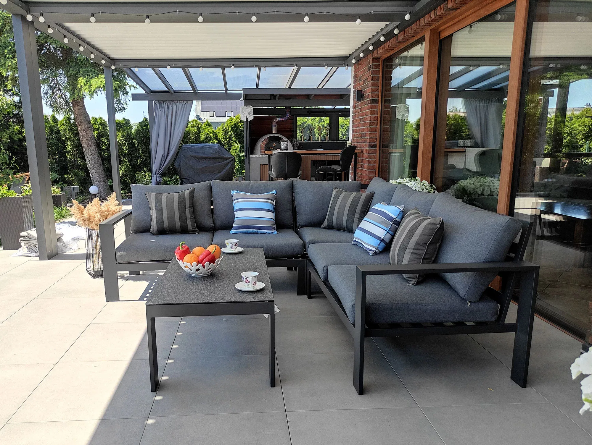 Aluminiowy narożnik 242×242 cm z grubymi poduszkami i stolikiem kawowym w komplecie. Minimalistyczny design, który służy przez lata bez kompromisów.