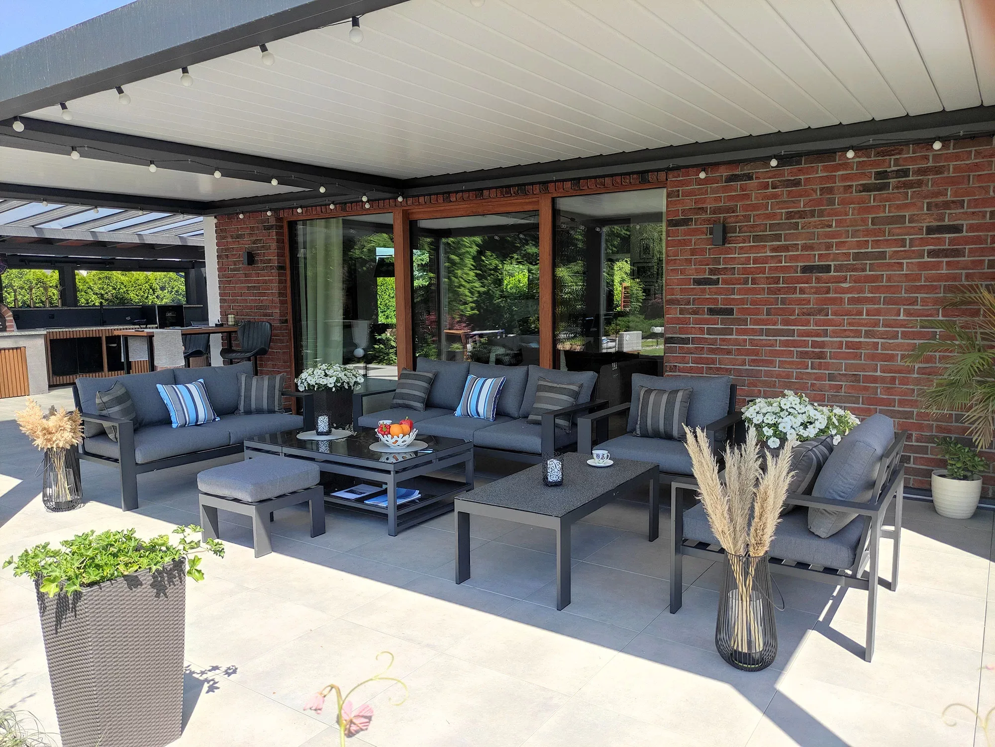Zestaw zapewnia 7 miejsc siedzących: sofa 3-os. (3 miejsca), sofa 2-os. (2 miejsca) i 2 fotele (2 miejsca). Podnóżek można traktować jako dodatkowe siedzisko. Zestaw idealnie nadaje się na duże tarasy od ok. 20 m².